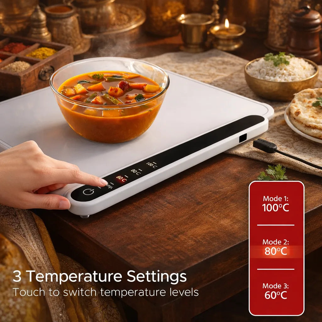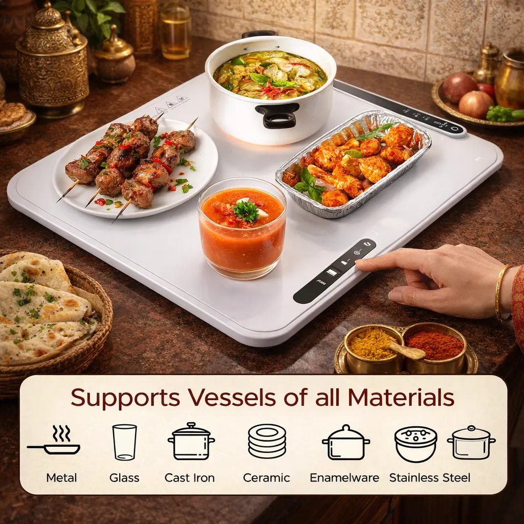 This warming tray is designed to keep cooked food warm during serving. It’s ideal for rotis, curries, rice, snacks, desserts, and multiple dishes during family meals, parties, or gatherings—without reheating again and again.