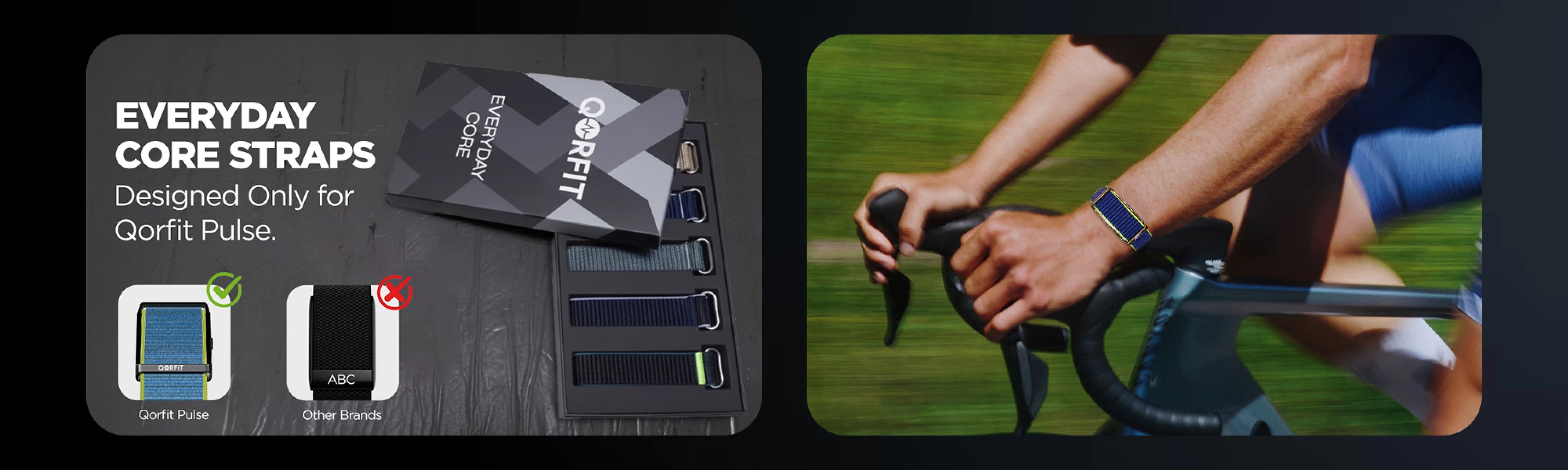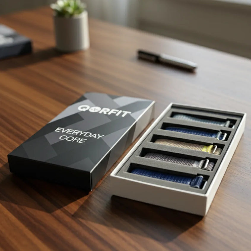 Two bands are included with the Qorfit Pulse: one black nylon and one black silicone. Colour bands are sold separately in packs of 5, available in two types — EVERYDAY CORE and VIBE CORE.
