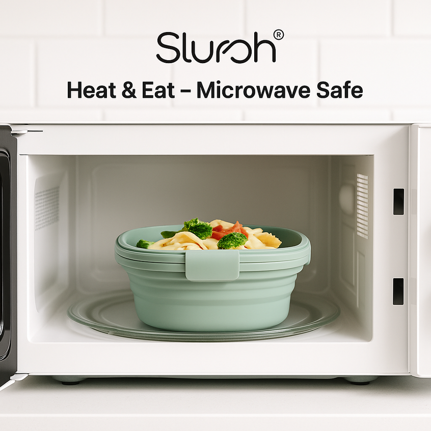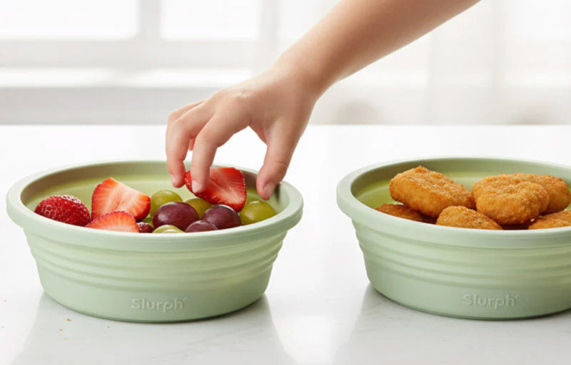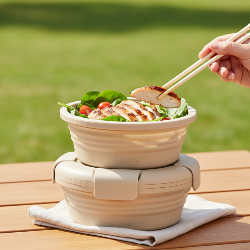 Traditional food storage wastes space and leaks frequently. Slursh collapses down, saving precious drawer and bag space without compromising meal capacity.