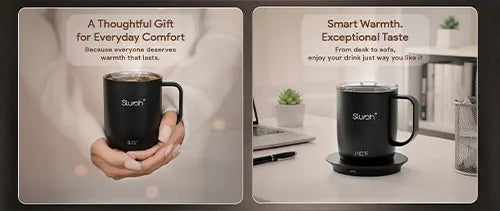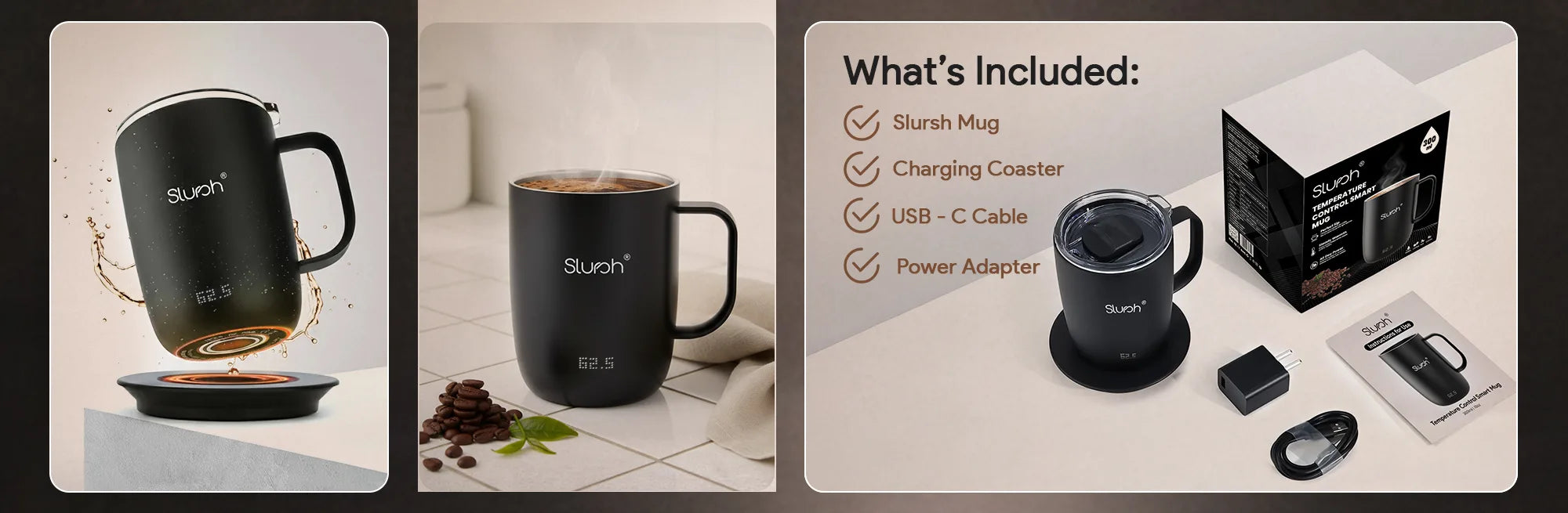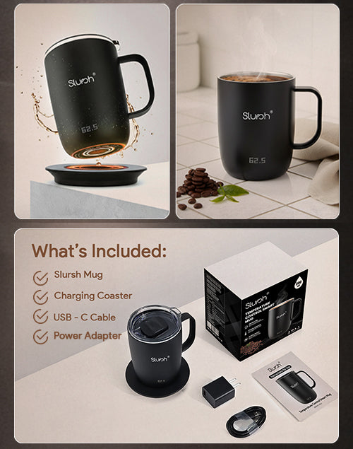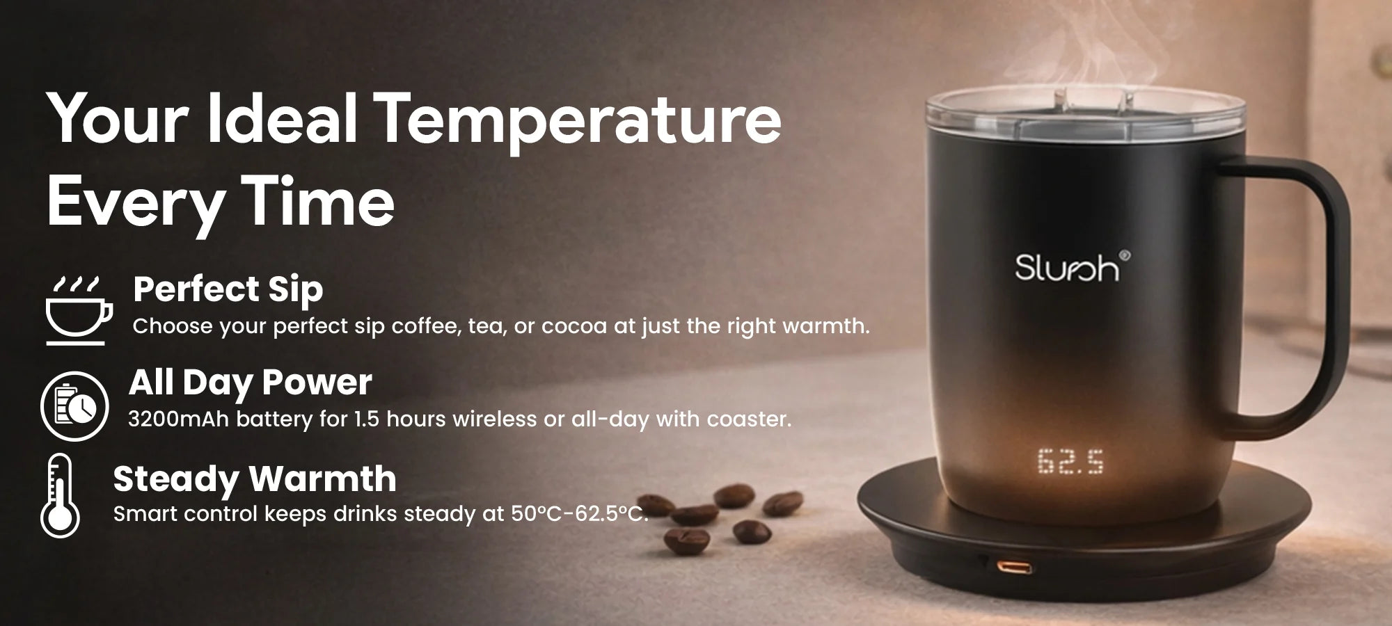When placed on the charging coaster, it keeps drinks warm for hours at your selected temperature.